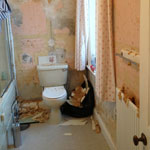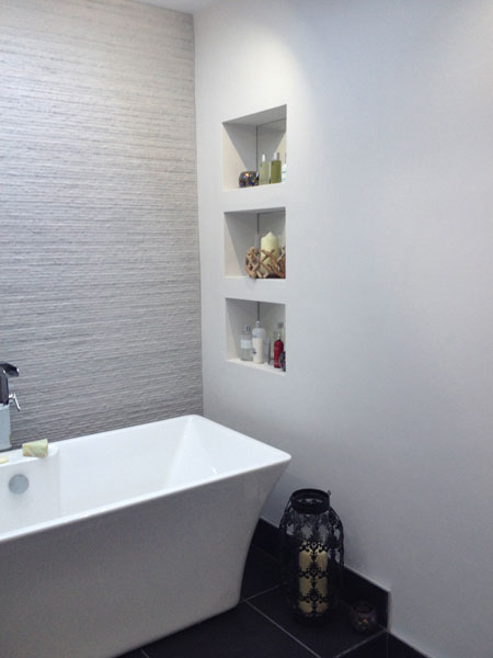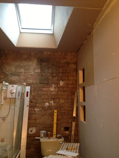 The works involved in this type of renovation were pretty huge, Michael removed all of the old latt and plaster from the walls, took down and replaced the ceiling, fixed some leaking roof tiles, laid new installation, installed a new velux window, removed and walled up the old window and then plastered throughout. After consulting with the plumber they even decided to fit a new floor to assist with the draining from the wet room! Everything was so well planned and although there was a lot of mess and dust it was always clean and tidy by the end of every day. The results speak for themselves – we have visitors just to see the bathroom now, it’s beyond our expectations!”