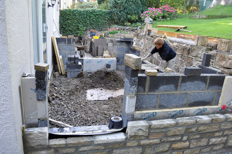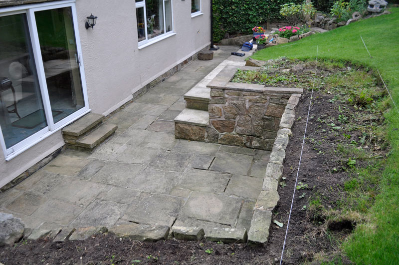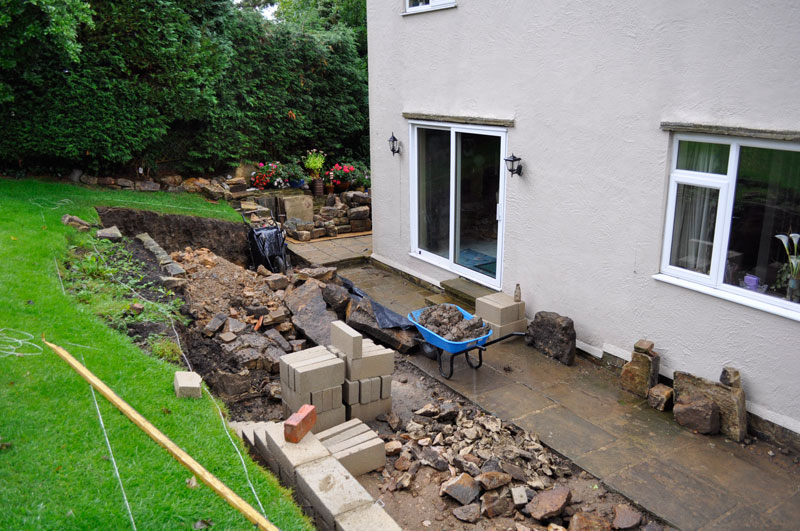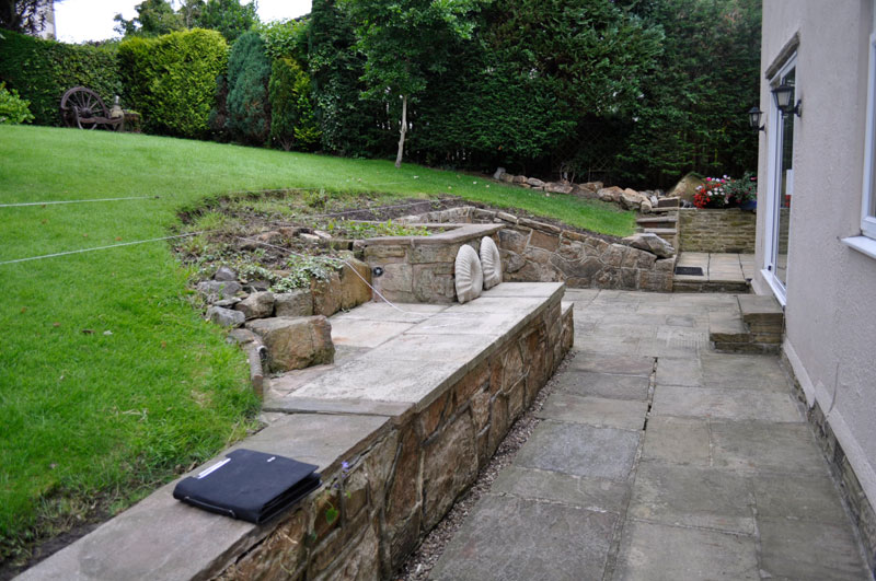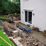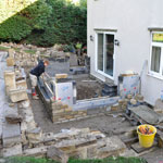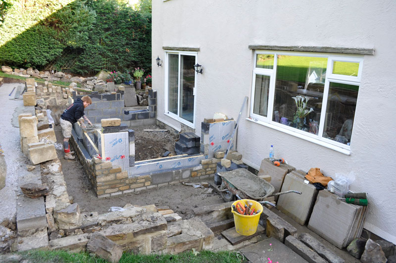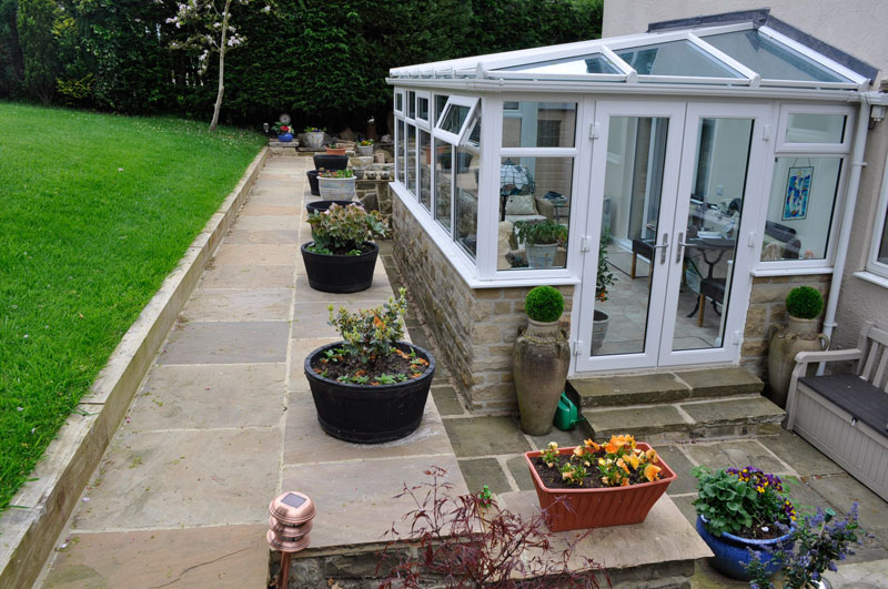 This property was located on the hillside below the Cow & Calf Rocks in Ilkley with limited access to the rear, therefore all excavation work had to be carried out by hand without the use of machinery. In excess of 40 Tonnes of garden soil, clay and bedrock was wheel barrowed from the rear to the front of the property – filling 6 large skips! Following the excavation works we created a stone retaining wall using some of the stone we uncovered during the digging out. The conservatory base was constructed using random walling sandstone and the top a mixture of uPVC framework and argon gas filled “blue glass”
