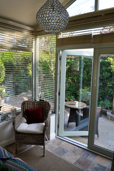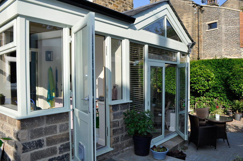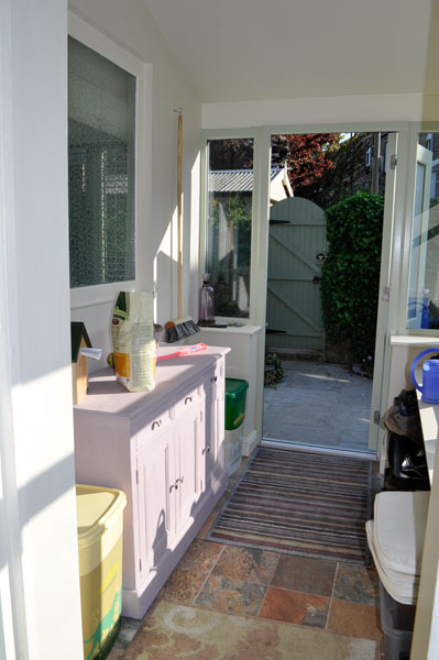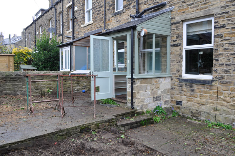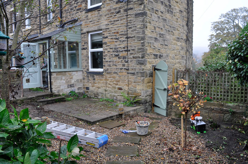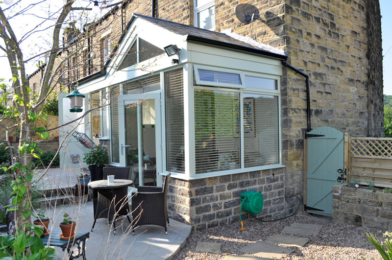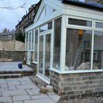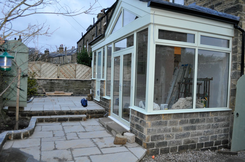 The client wanted to replace their existing lean-to porch with an orangery style extension, featuring 2 sections: 1. A coat / boot room with access into the kitchen. 2. A more formal lounge / reading room with open access into the dining area and gardens. We worked with our architect and the client to formalise the design and due to it being within the Conservation Area we had to obtain planning permission. The orangery was built with a stone base and then we used a timber frame (rather than uPVC) and a slate roof. Externally we laid new stone paving over split-levels and a slate cobbled edging to create interesting shapes to the patio and garden bed areas.