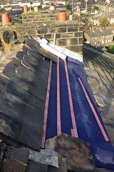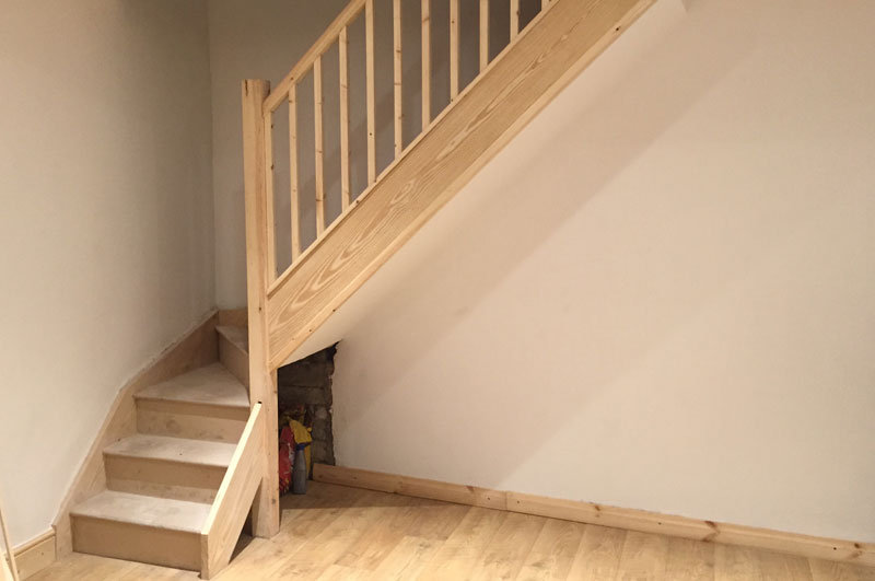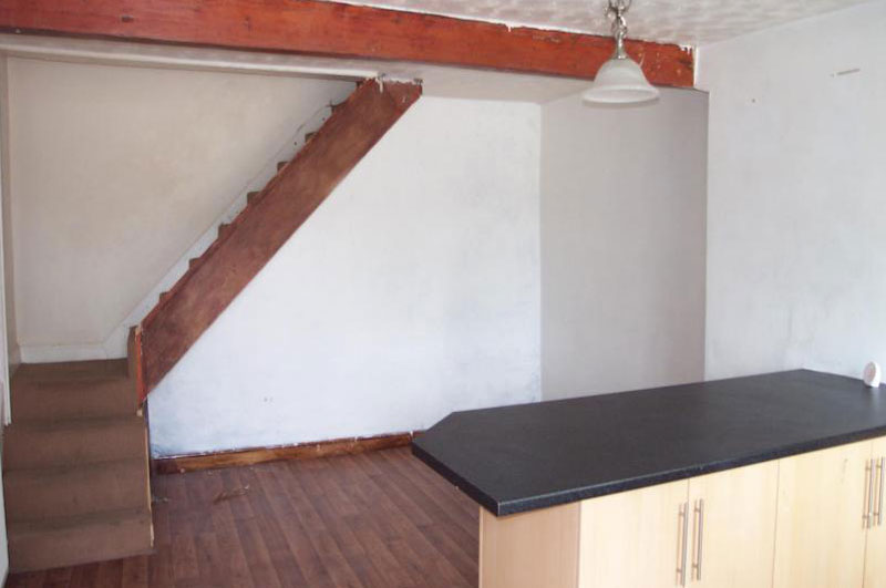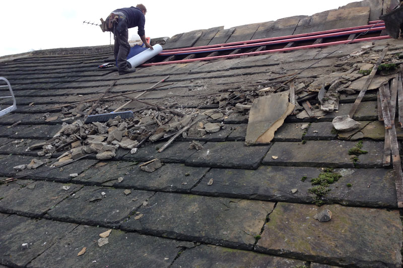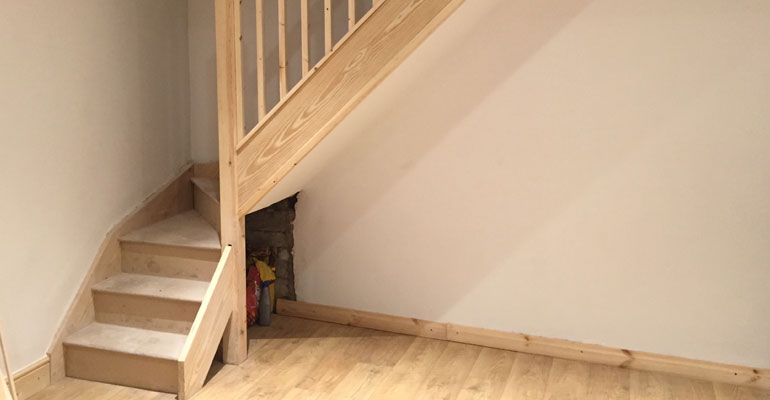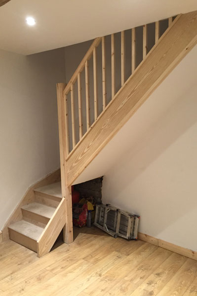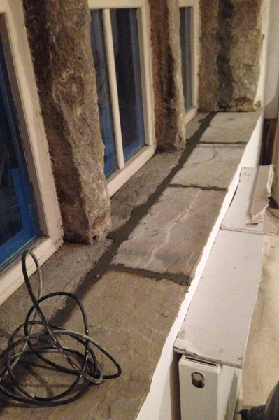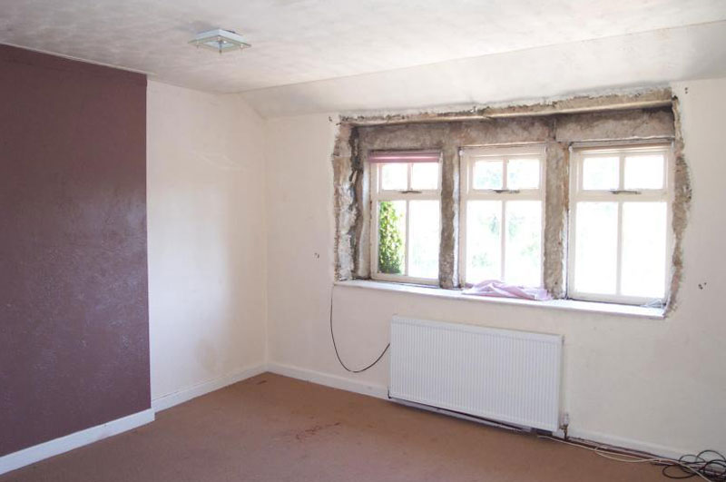 The client had purchased this Grade II listed building, which was in need of some restoration. After removing the plaster from the walls in the kitchen-dining room we uncovered the original stone fireplace, which had been boarded over for many years! The client was delighted to have the option of installing a multi fuel stove. The original staircase, which would have been built over 100 years ago, was beyond repair so we had a handcrafted bespoke timber staircase made and fitted. Due to the property being listed we had to repair, rather than replace the existing stone heads and cills at first and second floor windows. As with all properties it is critical to keep the roof in good repair – in this case we stripped off the existing stone slates and replaced the damaged, removed the old laths & felt then replaced with highest grade roof laths and breathable felt, alongside treating the roof timbers with a spray preservative.